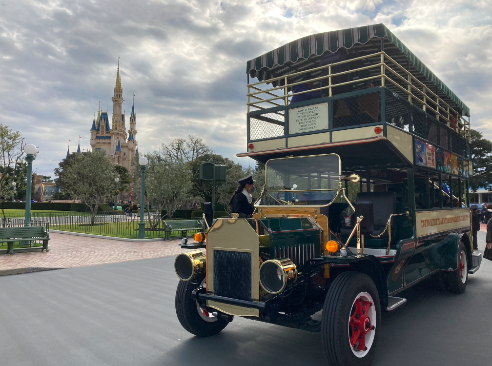 このバスで東京ディズニーランドの中心にあるプラザを1周する間に、その周りの7つのテーマランドを簡単にご紹介しましょう。